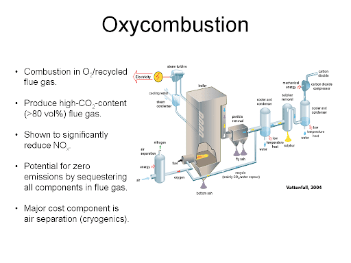 Coal-fired plants typically use atmospheric air in their boilers. Oxy-Combustion is a future technology that uses purified oxygen to burn coal. The oxygen and coal react chemically, producing water vapor (steam) and carbon dioxide, which are used to turn a turbine. The carbon dioxide is separated from the steam and can be sold as a separate product.